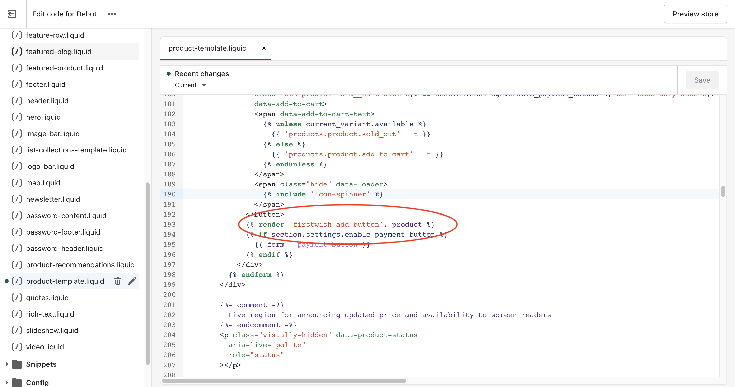 In Debut the ideal place to add the snippet is between lines 192-193. This will include the add to wishlist button between the “Add to Cart” and “Buy it Now” buttons. Feel free to add the button to any other location on the page that better fits your preferences.