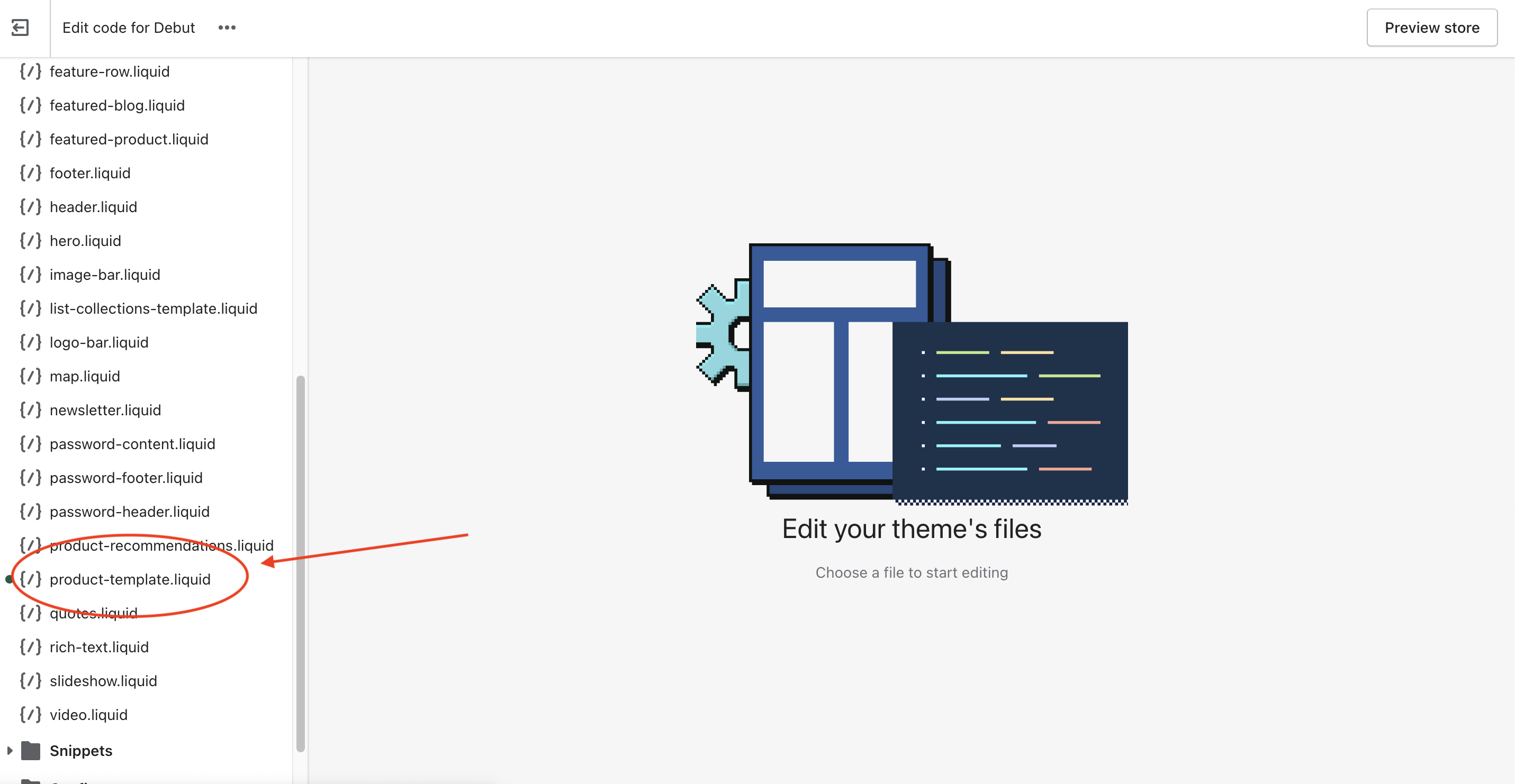 The file responsible for rendering the product page in the Debut theme is called “product-template.liquid” and it can be found in the “Sections” folder. Please keep in mind that if you're using a different theme or even a modified version of Debut the file name might be different. Click on the file name once you find it.