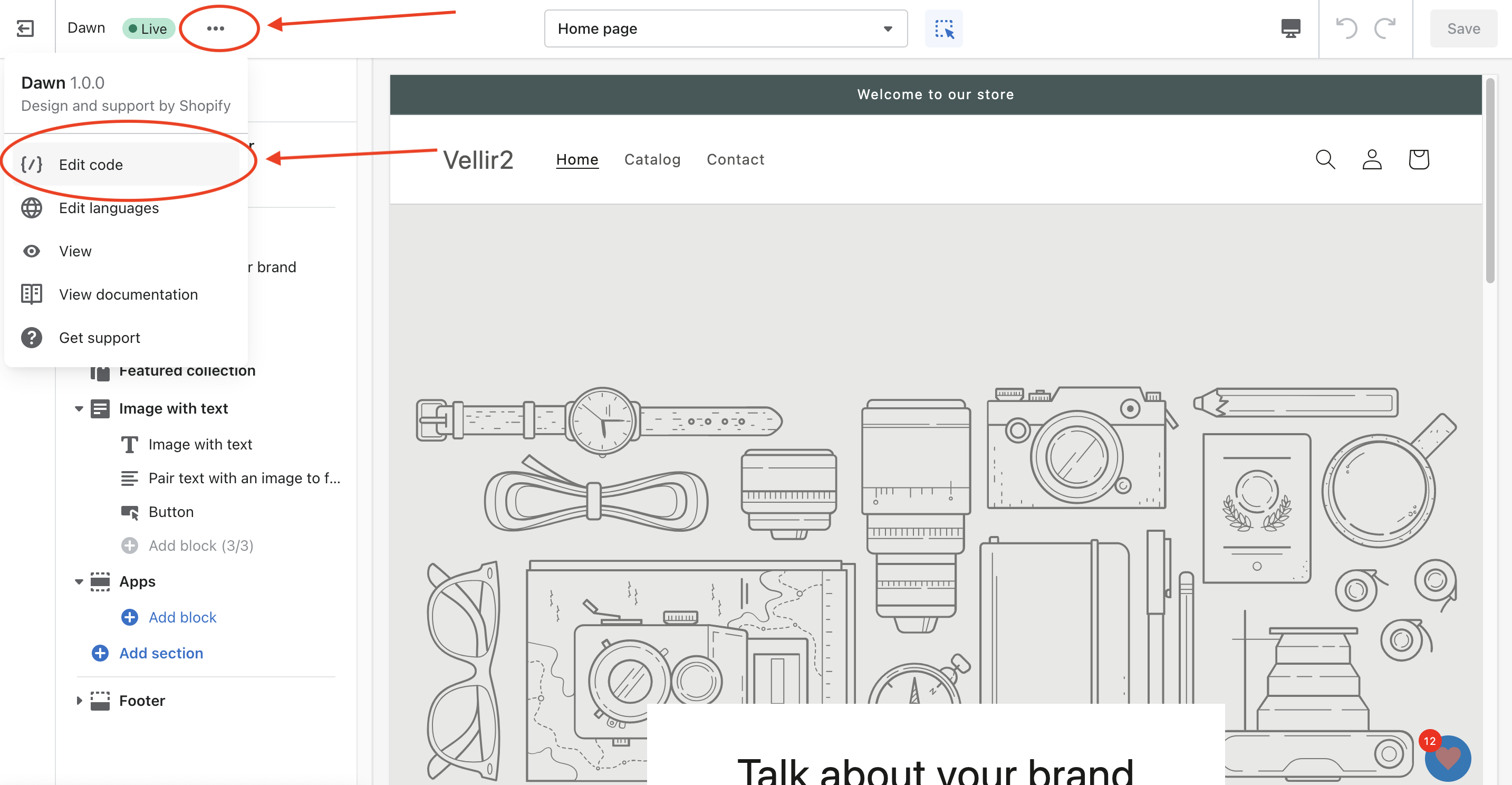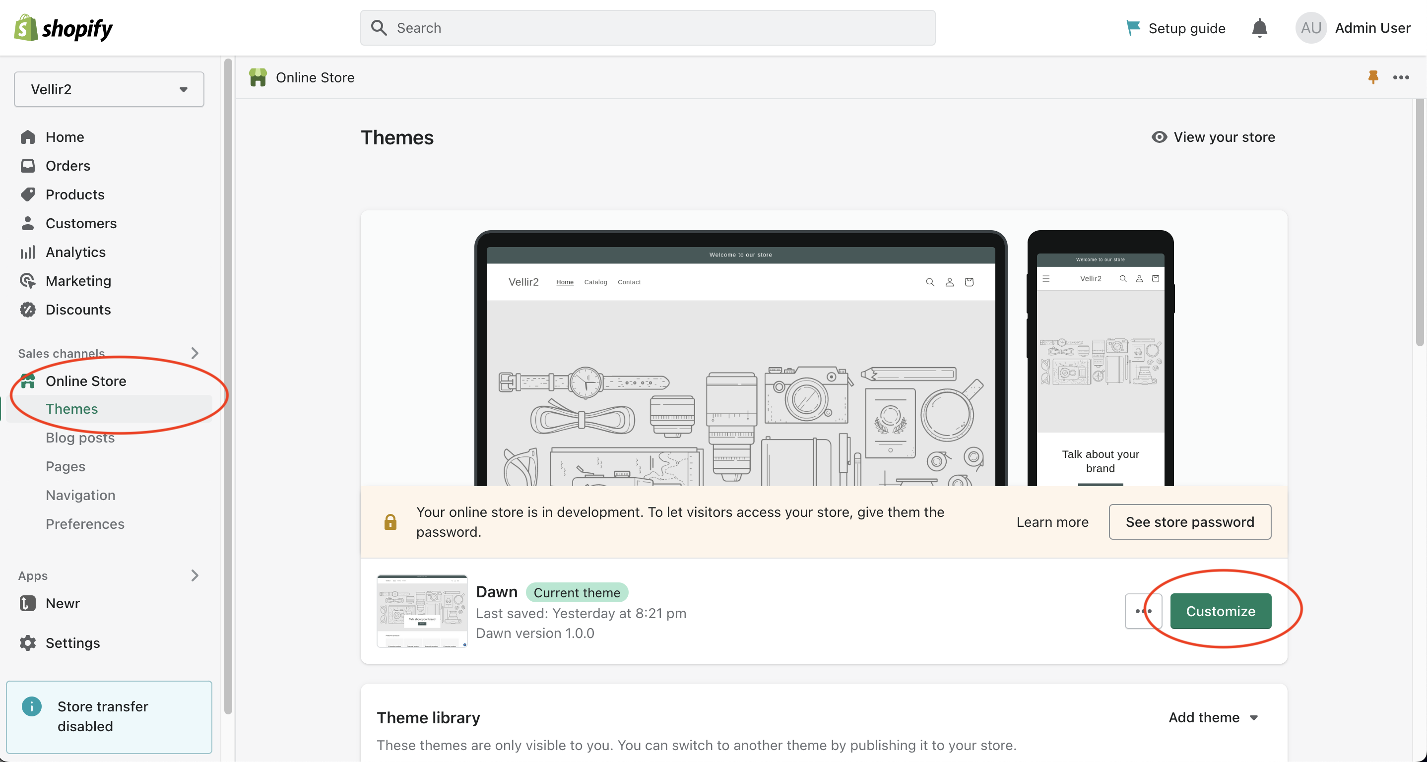Before making any changes it's recommended to either duplicate the live theme or pick another theme from the library. This way you can minimize the risk of impacting your live store if something goes wrong. From your Shopify's admin page, click on “Online Store” -> “Themes” and click on “...” next to “Customize” and select “Duplicate”. Once you've done that click on “Customize”.