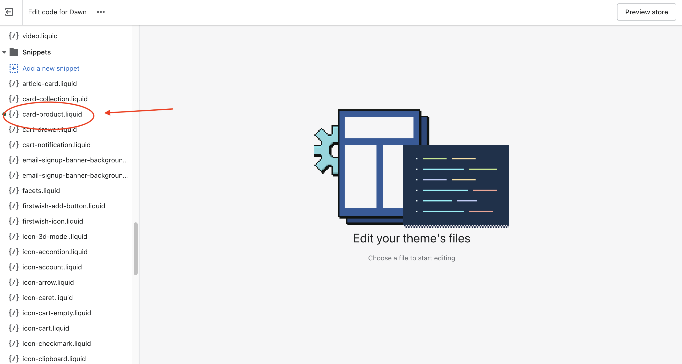 The file responsible for rendering the product image in the Dawn theme version 7.0.1 is called “card-product.liquid” and it can be found in the “Snippets” folder. Please keep in mind that if you're using a different theme or even a different version of Dawn the file name might be different. Click on the file name once you find it.